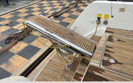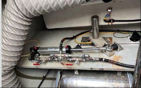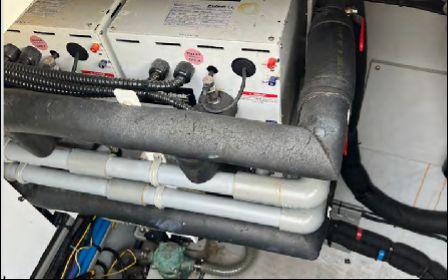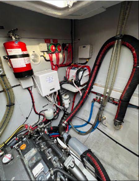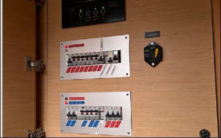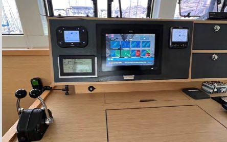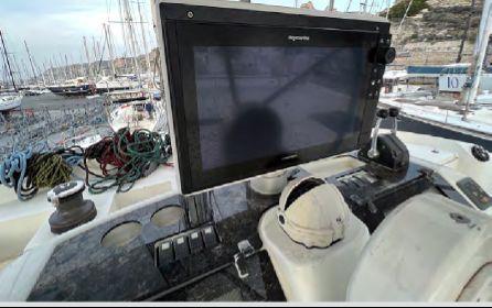 L’électronique Raymarine complète inclut radar, pilote automatique, instruments vent/vitesse/profondeur, double écran intérieur et flybridge (2022). Dessalinisateur Aquamatic (628h), groupe électrogène, ligne de quai, convertisseurs 2000W et 3000W.