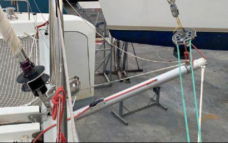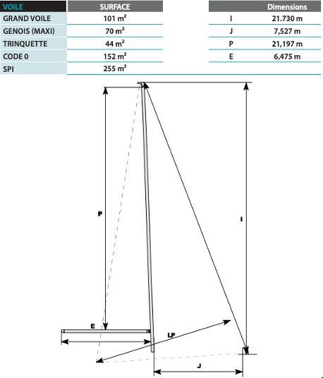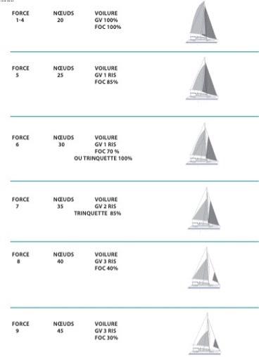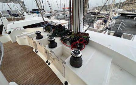 Le plan de voilure comprend une grand-voile lattée de 101 m², un génois autovireur de 70 m² et un Code 0 de 152 m² sur enrouleur électrique (2022). Les manœuvres sont entièrement centralisées au flybridge grâce aux 5 winchs électriques, permettant une navigation en solo ou en équipage réduit en toute sécurité.