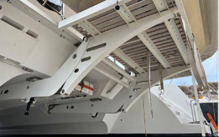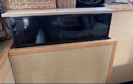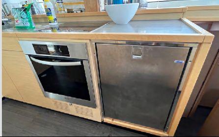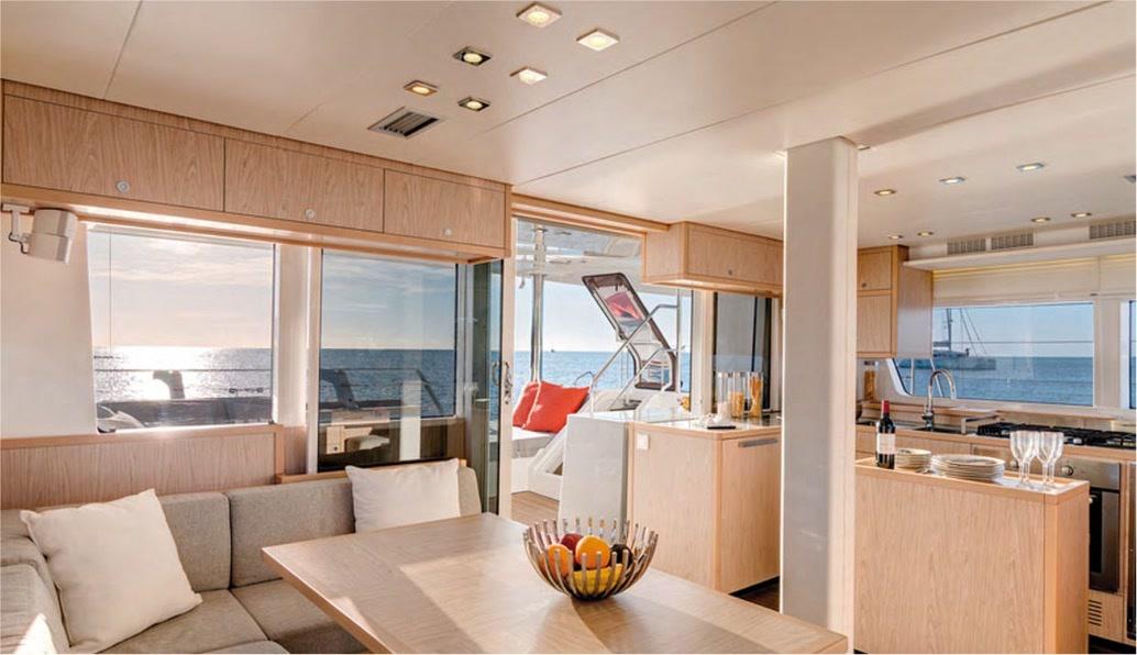 Le carré panoramique lumineux comprend un salon confortable avec télévision escamotable (2022), système audio Fusion (2022), coffre-fort intégré et une cuisine en L avec îlot central, rare sur ce modèle. L’équipement est complet : four électrique, plaques induction, double réfrigérateur (dont un ajouté en 2022), congélateur double tiroir (2022), lave-vaisselle Miele, lave-linge Miele, machine à glaçons (2022), machine Nespresso, Sodastream.