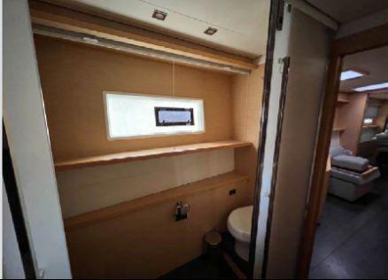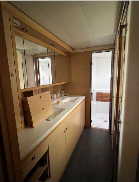 La configuration propriétaire offre une coque tribord entièrement dédiée au propriétaire avec lit King Size, bureau, nombreux rangements, double vasque, grande douche séparée et WC indépendant. La coque bâbord accueille deux cabines doubles avec salles d’eau privatives et WC électriques. Une pointe skipper aménagée complète l’ensemble.